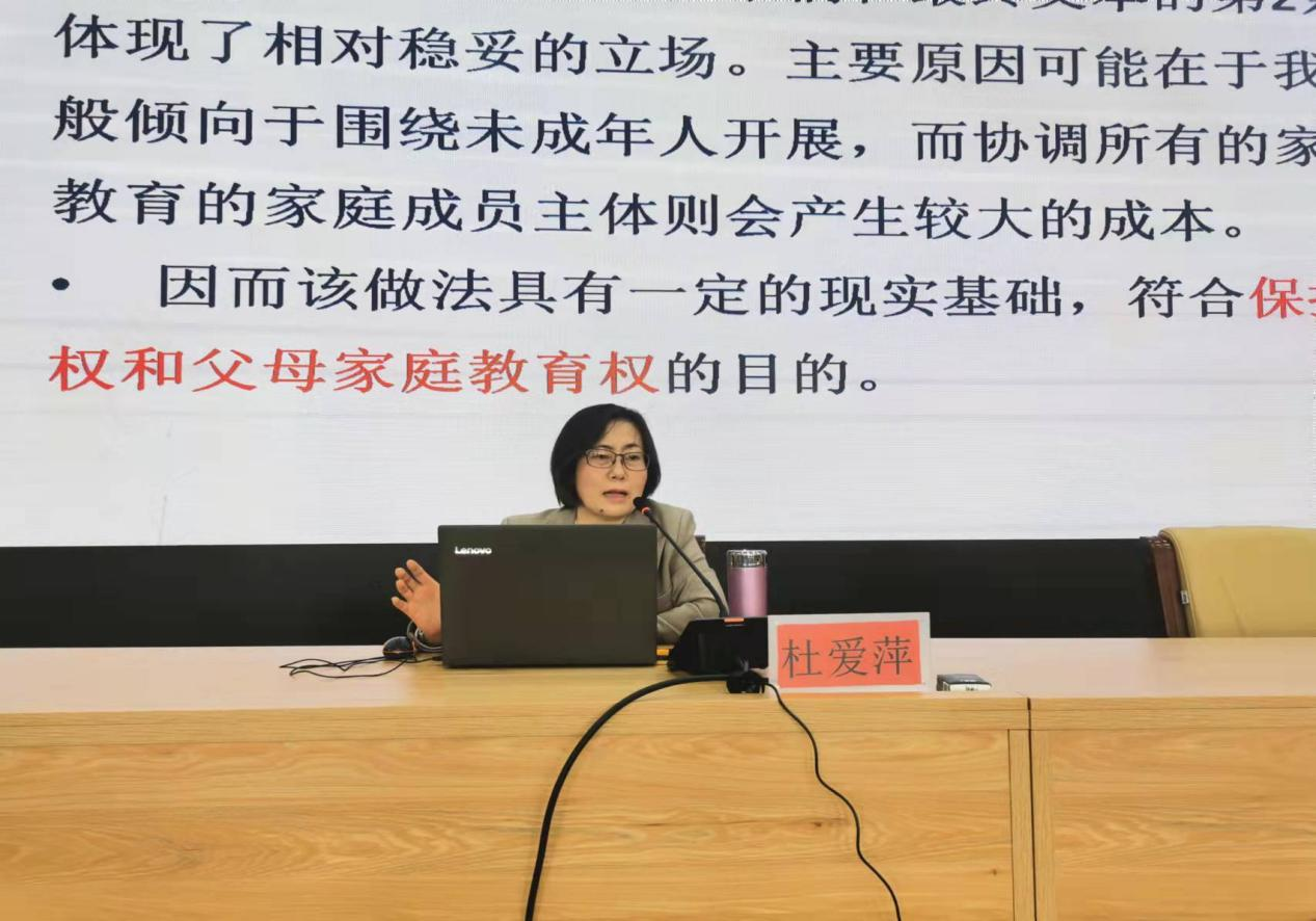 5月9日至15日,是全国首个“家庭教育宣传周”。永利官网杜爱萍副教授应邀参加了云南省妇联与云南省教育厅举办的“送法进万家 家教伴成长”为主题的系列活动。5月9日与5月12日,杜爱萍副教授以“家事入国法 教育促和谐”为主题,为来自31个省级单位的干部以及玉溪市红塔区妇儿工委成员单位工作人员解读了《家庭教育促进法》的出台背景及意义、法律依据、具体内容以及适用中须注意的问题等。参加培训成员均表示对《家庭教育促进法》有了更深刻的认识。