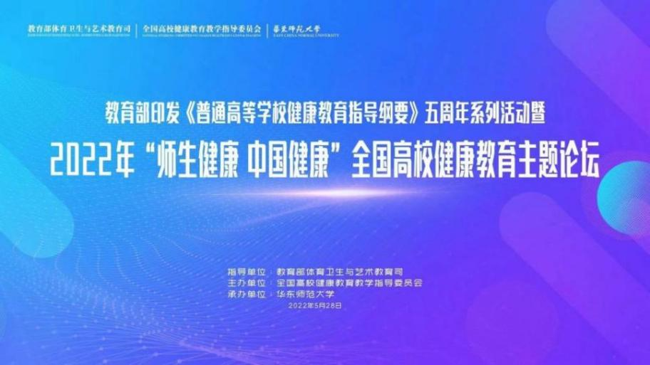 2022年5月28日,由教育部体育卫生与艺术教育司指导、全国高校健康教育教学指导委员会主办、华东师范大学承办的教育部印发《普通高等学校健康教育指导纲要》五周年系列活动暨2022年“师生健康 中国健康”全国高校健康教育主题论坛在线如期举行,来自全国健康教育领域的知名专家、全国高校健康教育教学指导委员会委员分别从“新冠疫情与高校健康教育”“新冠疫情与高校心理健康服务与援助”“新冠疫情与高校师生居家锻炼”三个主题展开深入交流与讨论,12.7万余人次在线观看学习。
