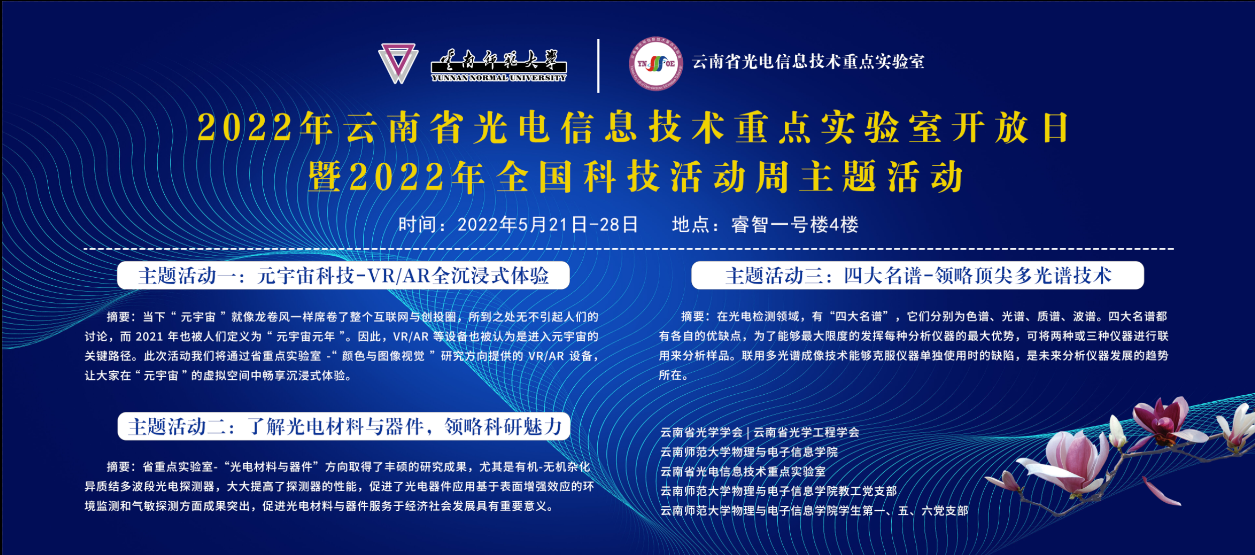 5月21日-28日,云南省光电信息技术重点实验室开放日暨2022年全国科技活动周“走进科技,你我同行”主题活动在永利官网呈贡校区物理与电子信息学院睿智1号楼举办。省光电信息技术重点实验室各方向负责人根据各自研究方向和领域特点,分别组织了“元宇宙科技”、“光电材料与器件”、“四大名谱”三项主题科普活动,内容涉及了从光电材料到光电器件及从光电系统设计到光电子产业化集成。此次科技活动周系统地向参与者介绍了光电信息技术对云南生物医药、大健康、军民融合产业、新材料、先进装备与制造等产业发展起到的重要支撑作用。