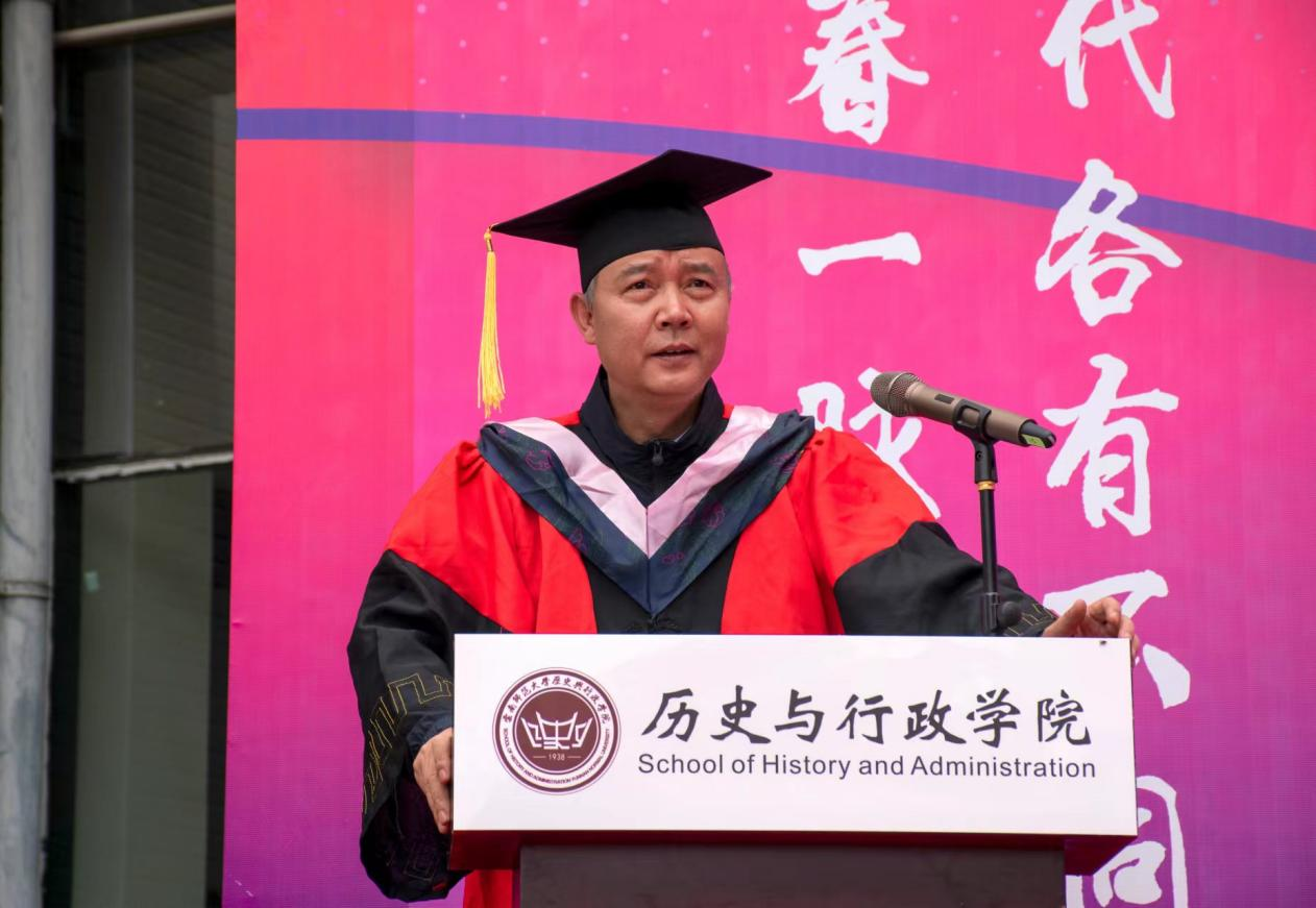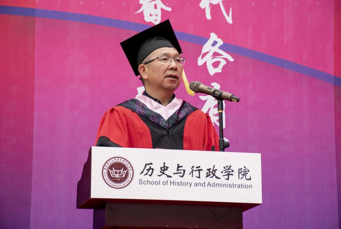 典礼伊始,全体起立,奏唱国歌。校党委副书记张玮致辞,他向历史与行政学院全体本科毕业生表示祝贺,向为同学们成长付出辛劳的学院全体教职工致以敬意,向同学们的父母家人表示感谢。临别之际,他希望同学们永远懂得刚毅坚卓、宽容豁达,不忘坚持学习、感恩回报,始终敢为人先、勇于超越。