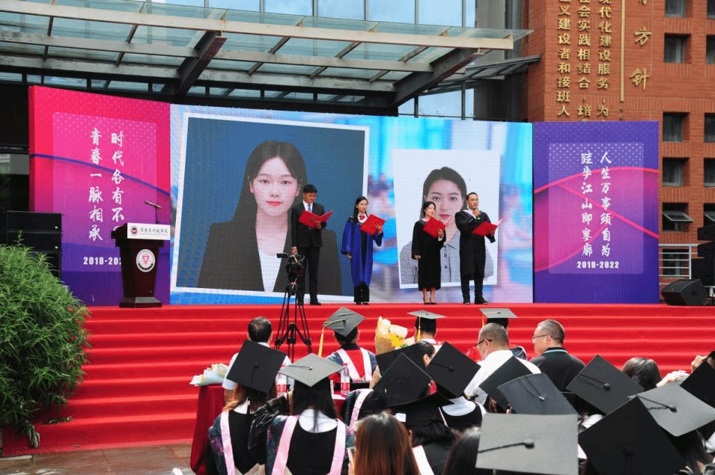 随后,李毓、金玉、何佳、世翱蔓、王羿涵等同学送上了《春风十里》《匆匆那年》《你曾是少年》等歌曲联唱,将典礼气氛推向高潮。教师代表方天建娓娓道来与同学们四年的《缘分》,他的发言饱含感情又幽默诙谐,现场笑声不断。