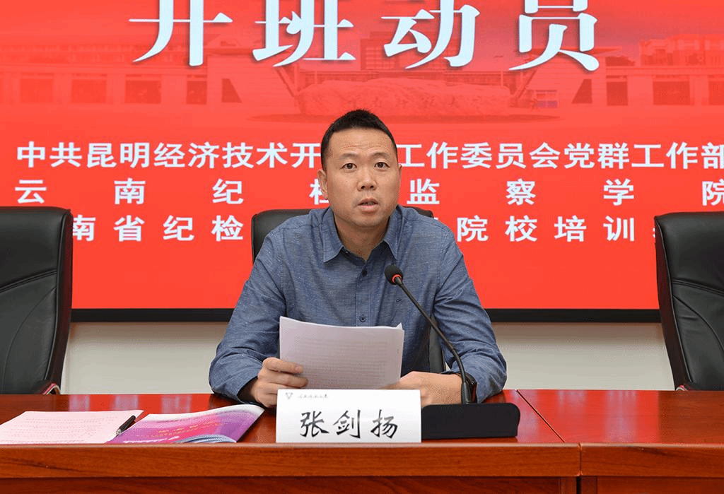昆明经济技术开发区党工委委员、驻区纪检监察组组长张剑扬作开班动员讲话并提出三点要求:一是统一思想认识,提振工作精神;二是珍惜学习机会,提升业务素养;三是严守培训纪律,树立良好形象。
