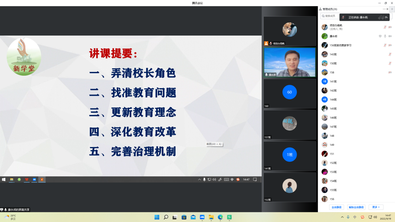 9月19日,云南省“万名校长培训计划”第八期“名家讲座”第八讲在8858cc永利唯一官方网呈贡校区举行。电子科技大学附属实验小学校长、正高级教师康永邦作了《我是怎样当校长的:兼谈“新学堂”的教育主张》线上专题讲座。