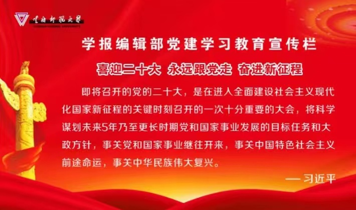 加强党建学习教育宣传栏建设,及时传达总书记最新指示精神。深入学习“习近平总书记重要讲话精神,迎接党的二十大”,紧跟未来5年党和国家事业发展的目标任务和大政方针,不断服务全面建设社会主义现代化国家新征程的需要,充分发挥学报编辑部理论研究和宣传的阵地作用,研究好、宣传好中国特色社会主义,以理论创新服务中华民族伟大复兴,讲好中国故事,发出中国声音。
