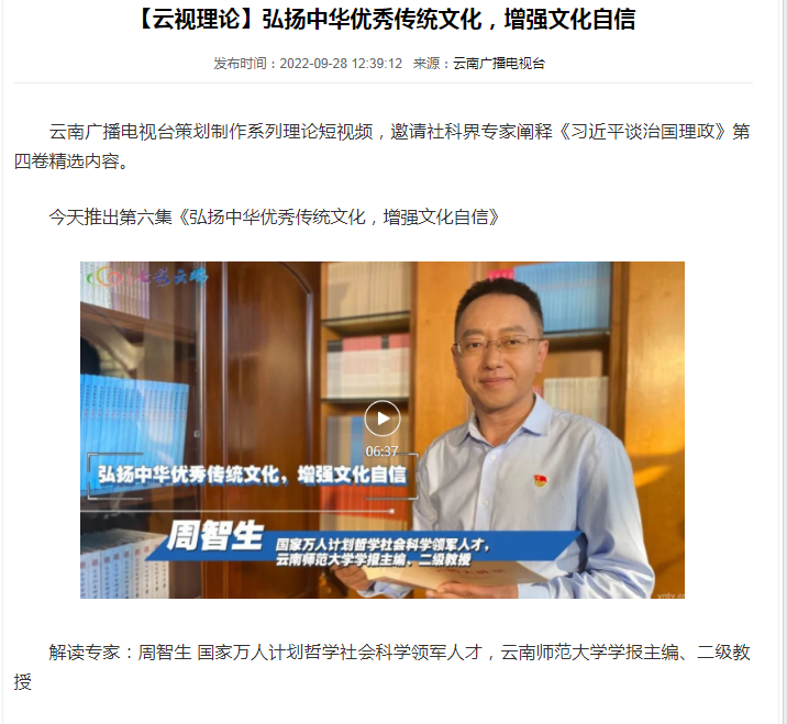 模范带头,创先争优。学报编辑部主任周智生应云南广播电视台邀请录制理论短视频,以学习宣讲《习近平谈治国理政》第四卷为基础,主讲了《弘扬中华传统文化,增强文化自信》专题。专题播出后,云南各大影视传媒均进行了转发和转播,取得了较好的社会效应和影响。