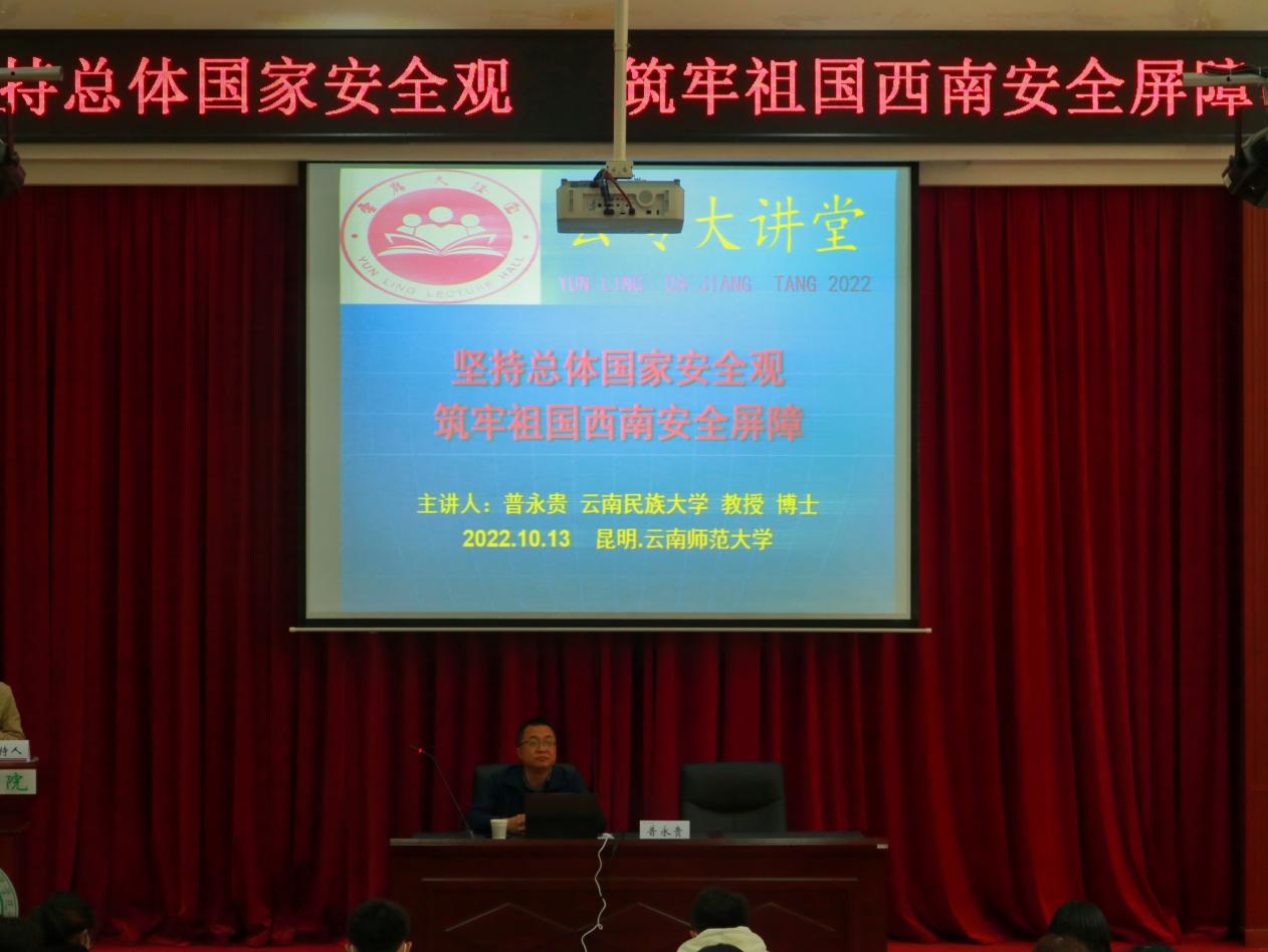 10月13日下午,2022年“云岭大讲堂•云南师大讲坛”第6讲在呈贡校区睿智3号楼106报告厅开讲。云南民族大学普永贵教授以“坚持总体国家安全观,筑牢祖国西南安全屏障”为题作了专题讲座。永利官网150余名师生参加讲座。讲座由生命与科学学院副院长周峻沛主持。