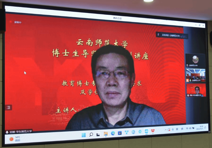 为深入贯彻落实全国研究生教育大会精神,加强教育博士专业学位指导教师(以下简称“教育专博指导教师”)队伍建设,提升教育专博指导教师的指导能力和水平,全面提高学校教育博士研究生的培养质量,11月11日上午,永利官网在呈贡主校区行政楼340会议室举办8858cc永利唯一官方网博士生导师培训系列讲座第二讲——教育博士专业学位培养过程及学位论文基本要求分析。全校教育专博指导教师、教育专博研究生近100人集中收看华东师范大学教育高等研究院副院长、全国教育博士专业学位研究生教育专家工作组成员吴刚教授作的线上专题讲座。讲座由研究生院副院长罗利佳主持。