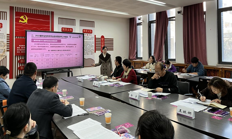 教育学部党委副书记朱静虹从2022届毕业生年终毕业去向落实率规划、2023届毕业生就业意愿落实摸底排查情况、2023届毕业生就业创业整体工作开展情况以及2023年“互联网+”大学生创新创业大赛筹备情况四方面进行汇报。学部党委书记禹紫灵,学部副主任杨舒涵、刘六生、马谐等结合分管工作就目前就业工作中存在的问题进行了汇报。系主任李鹏、李林曦,班主任吕瑾等就学生就业过程中的观念转变、困惑等进行了交流。就业处副处长李映松、创新创业学院办公室副主任白宇等就教育学部在就业工作中存在的问题给出了具体的意见建议。