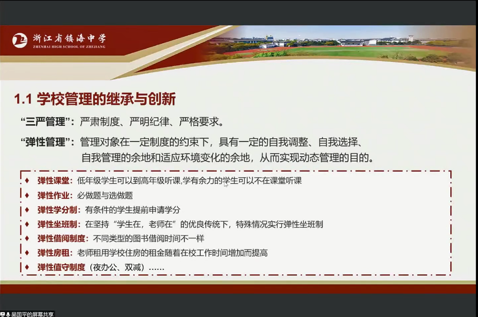 吴国平以自身学校的概况为事实依据,从继承与创新、外部与内在、人与物、决策与执行、规范与个性、理想与现实、政治与教育、领导与管理八个方面向学员们阐述了如何正确处理办学过程中的若干关系。他指出办学要注重继承与创新的结合。学校发展的根本在创新,但没有继承的创新会使发展失去方向。同时,办学还要注重规范与个性的统一。规范化使学校正常有序地运行,个性化使学校更有品位和发展力。他认为外部条件是办学的基础,内部实力是办学的关键,只有外树形象、内强实力,才能促进学校的可持续发展。他强调“人”是办学的关键和目的,只有落实教育的人本属性,遵循教育规律和人的身心发展规律,才能实现培养德智体美劳全面发展的社会主义建设者和接班人的教育目标。