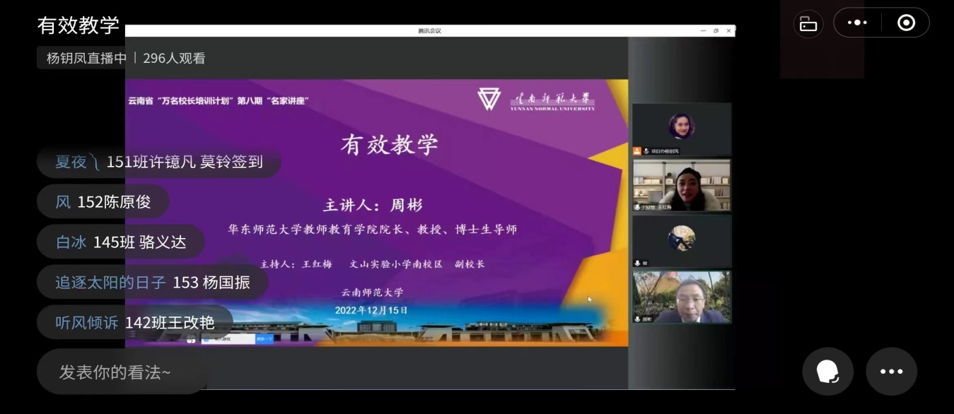 12月15日上午,云南省“万名校长培训计划”第八期“名家讲座”第三十七讲在8858cc永利唯一官方网呈贡校区举行。华东师范大学教育学院院长、博士生导师周彬作了题为《有效教学——双减背景下学科高质量教学的路径选择》专题讲座。