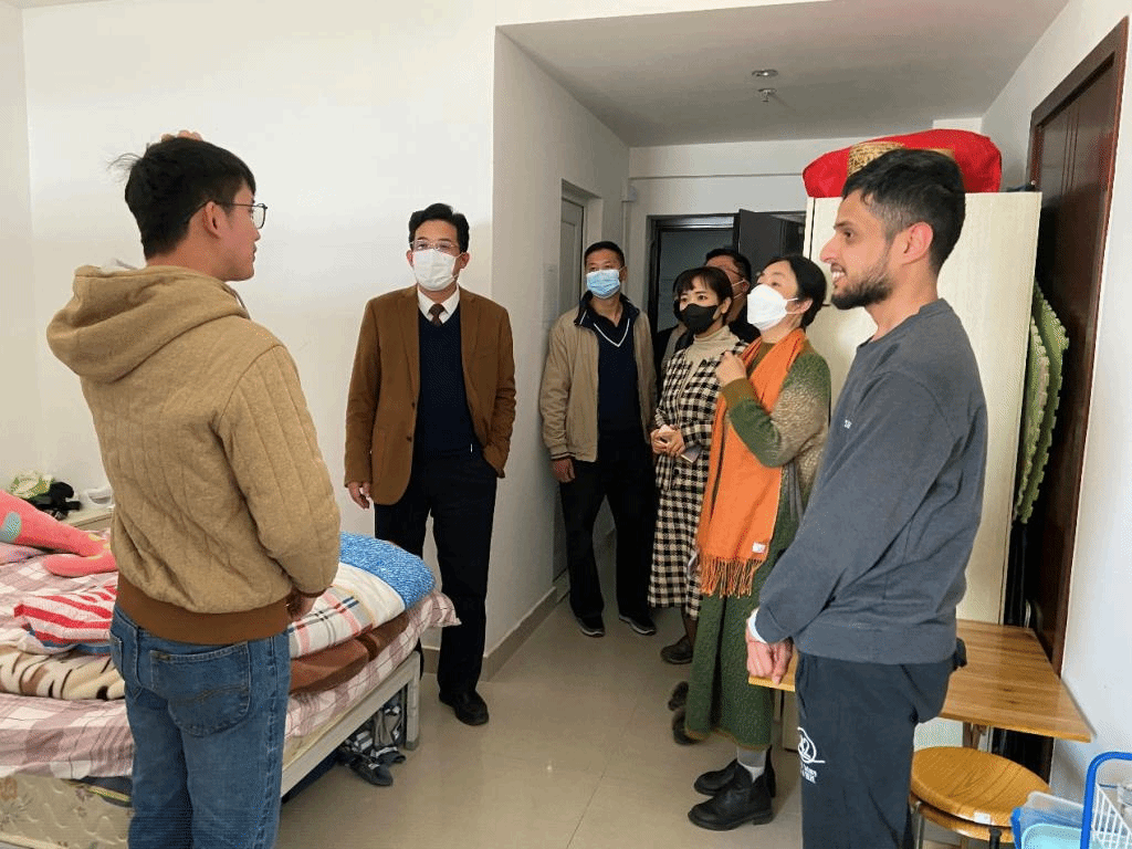 2023年春季学期,永利官网留学生陆续来华返校。为了解永利官网留学生返校后在校情况,解决留学生生活学习中遇到的实际困难,3月8日下午,云南华文学院领导及学院留学生事务办走访了留学生宿舍。