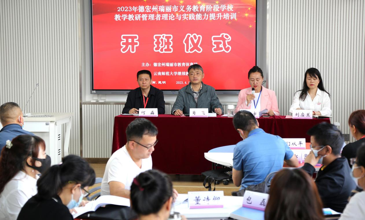 4月10日,受德宏州瑞丽市教育体育局委托,由继续教育学院承办的德宏州瑞丽市义务教育阶段学校教学教研管理者理论与实践能力提升培训在永利官网一二•一西南联大校区开班。瑞丽市教育体育局副局长李淑宇、教科中心主任何磊,继续教育学院党委书记肖飞、副院长刘应兰及70名中小学教学副校长、教务处、教科室主任、教学骨干、教科中心教研员参加开班仪式。仪式由刘应兰主持。