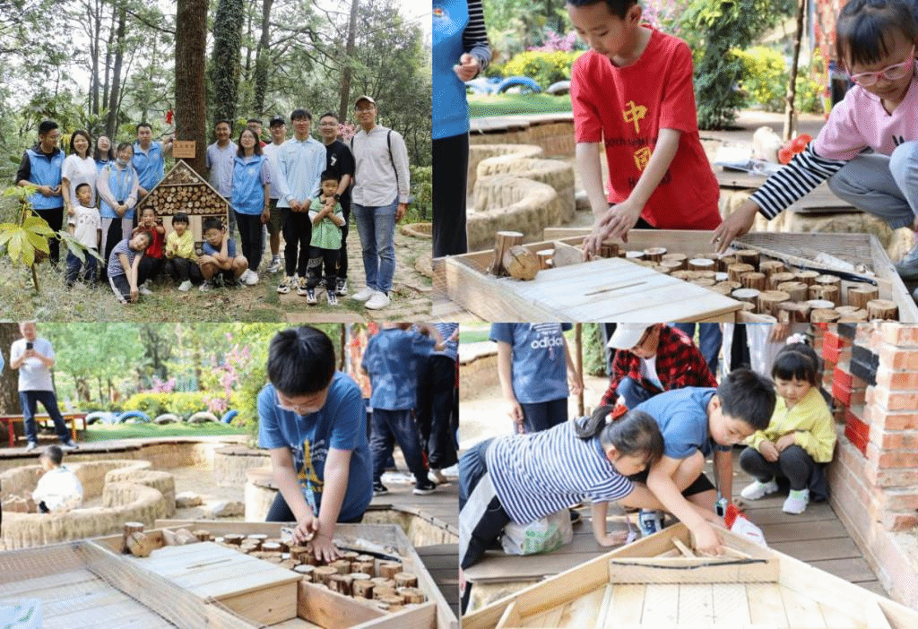 志愿者和小朋友们一起开展搭建昆虫旅馆活动