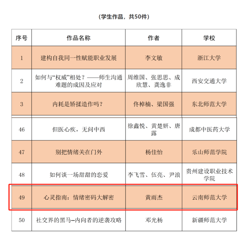 11月4日,普通高等学校学生心理健康教育专家指导委员会发布《关于全国高等学校心理健康教育微课征集展示活动遴选结果的公示》,职业技术教育学院2023级小学教育专业研究生黄雨杰作品《心灵指南:情绪密码大解密》成功入选。
