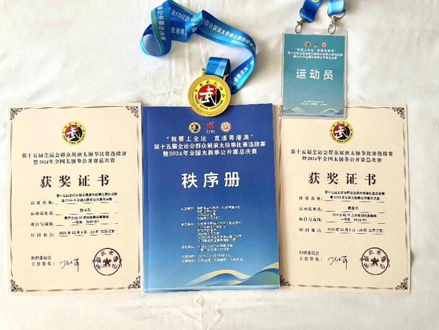 11月7日晚,“我要上全运 直通粤港澳”第十五届全运会群众展演太极拳比赛选拔赛暨2024年全国太极拳公开赛总决赛在江阴飞马水城文体馆举行,永利官网体育学院教师熊亚兵参加了本次比赛。经过激烈角逐,熊亚兵获得男子D组42式太极拳竞赛套路一等奖(8.83分)和男子D组32式太极剑竞赛套路一等奖(9.01分)共计两枚金牌。