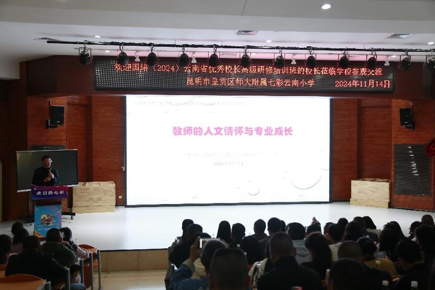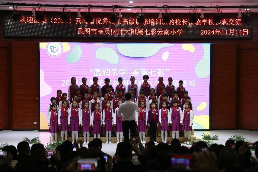 11月14日,国培(2024)云南省优秀校长高级研修班100名校长与跟岗校长们一起观看了学校特色大课间活动及艺术团展演,聆听了学校书记、校长彭文冲的讲座,观摩了特色班级文化,沉浸式感受学校办学理念及七彩少年阳光、健康、乐学的精神风貌。