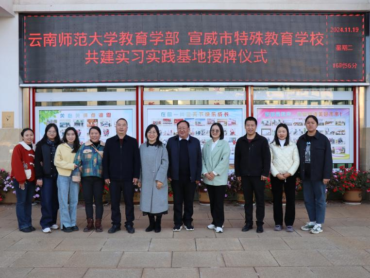 19日下午,教育学部一行到宣威市特殊教育学校,开展合作共建研究与实践教学基地挂牌等工作。签约仪式在宣威市特殊教育学校举行。宣威市委教育体育工委、教育体育局党组副书记王开良,宣威市特殊教育学校校长王鹏及全体教师,永利官网教育学部党委副书记朱静虹、教师代表参加了仪式。