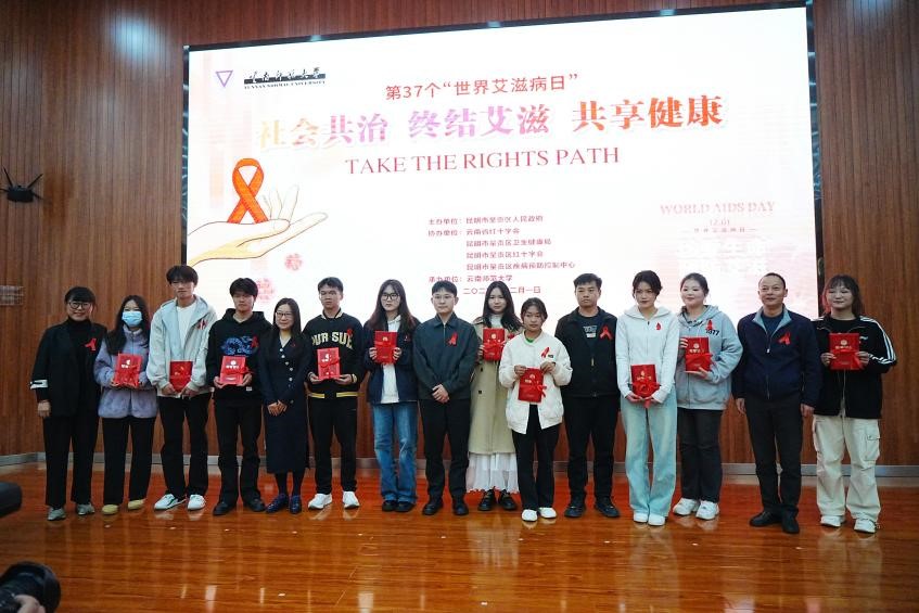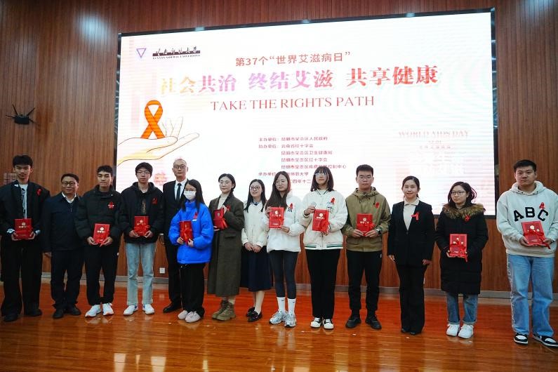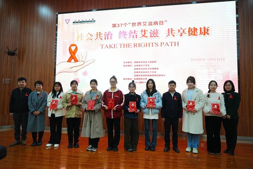 在第 37 个“世界艾滋病日”到来之际,12月1日下午,永利官网在呈贡校区举办第37个世界艾滋病日宣传教育活动。本次活动由昆明市呈贡区人民政府主办,8858cc永利唯一官方网承办,云南省红十字会、昆明市呈贡区卫生健康局、昆明市呈贡区红十字会、昆明市呈贡区疾病预防控制中心协办。昆明市呈贡区人民政府副区长王会飞,呈贡区防治艾滋病委员会成员单位主要负责人,永利官网团委书记郑伟俊、校医院院长广洁丽、学生处副处长詹镇宇以及各学院(学部)师生代表等430余人参加活动。