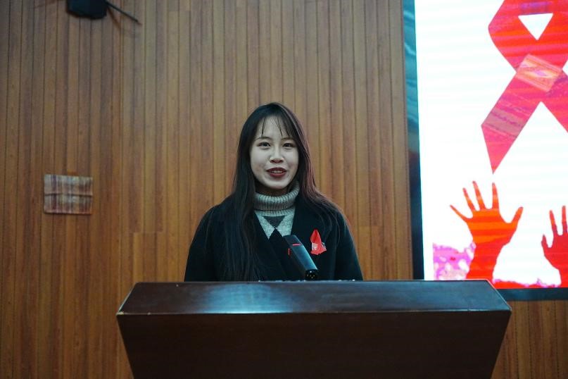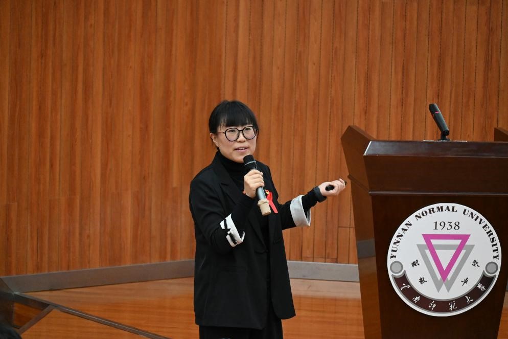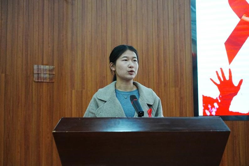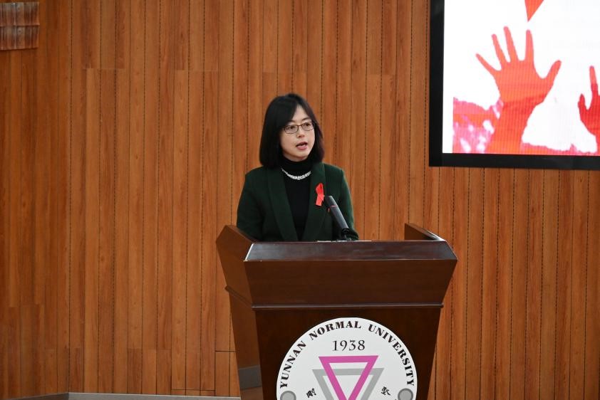 呈贡区疾病预防控制中心党支部书记丁高洁从艾滋病的起源和传播、怎样预防艾滋病、疫情分析三个方面展开艾滋病知识宣讲。她通过真实案例展示警醒师生,并与现场师生积极互动。