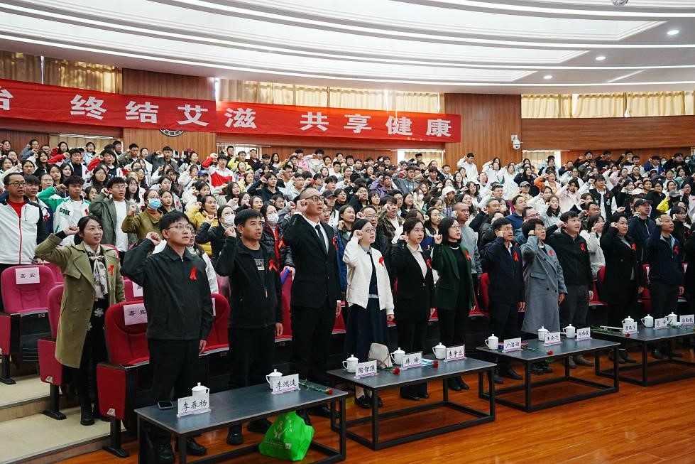 参加活动的人员佩戴红丝带,进行庄严的防艾宣誓。
