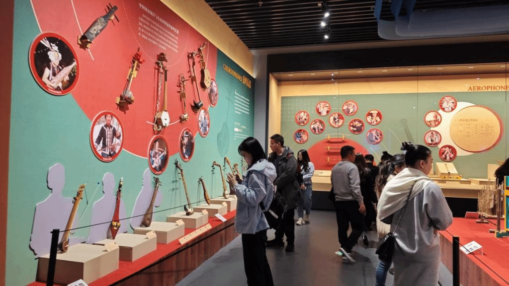 艺术学院“中国—南亚东南亚国家非遗音乐舞蹈教育资源数字化陈列馆”始建于2022年11月,作为国内首家以西南各省少数民族乐器展陈为主,辐射南亚东南亚国家特色乐器的博物馆,馆藏乐器展陈数量达到800多件。陈列乐器根据霍萨体系分成弦鸣、气鸣、体鸣、膜鸣乐器四大类,每件乐器附上民族、乐器类属、收录时间和地址、制作、捐赠人等详细信息和演奏照片,并附二维码,扫码即可观看乐器演奏视频。此次展出,拓展了陈列馆与省外博物馆的交流合作。