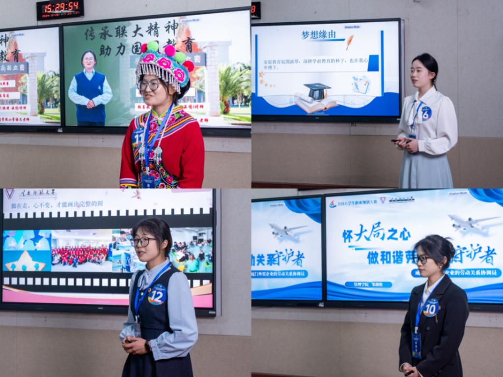 成长赛道19名选手按照抽签顺序,依次进行7分钟主题陈述、3分钟评委提问。选手们准备充分、自信沉稳、表达流畅,结合自己对目标职业的了解,合理论证了自己与职业的契合度。