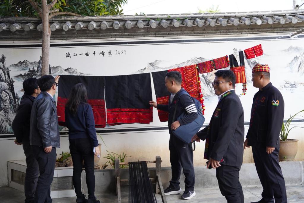 调研组先后走访了陇川县勐约乡营盘村岳岛小组、移民搬迁安置点(营盘小组)、帮中村、广瓦村温泉小组及勐约乡新型职业农民培训学校,深入考察景颇族织锦、象脚鼓舞、刀舞、刀术、器乐等非物质文化遗产。结合地理学部学科优势与实地自然人文条件,调研组与陇川县政府办公室督查专员张尔星、陇川县教育体育局副局长杨荣传、陇川县文化和旅游局副局长陈文婷、陇川县非遗中心苏常松及勐约乡各调研村基层干部、驻村第一书记、村民代表共同探讨勐约乡文旅产业发展规划,为推动当地文化传承与乡村振兴提供思路。