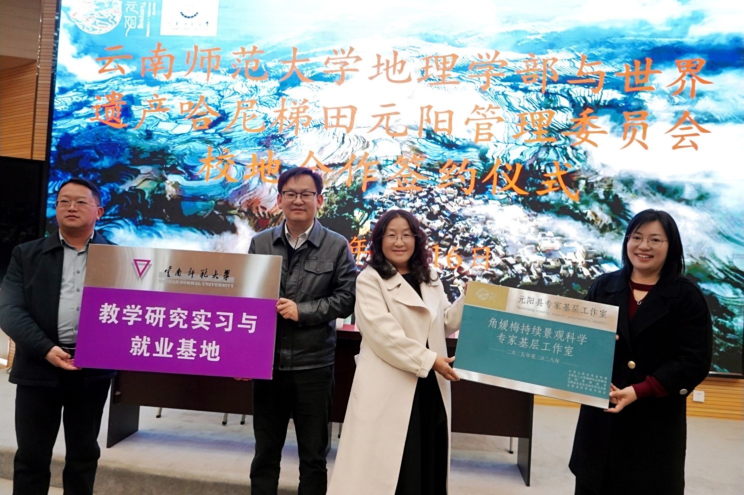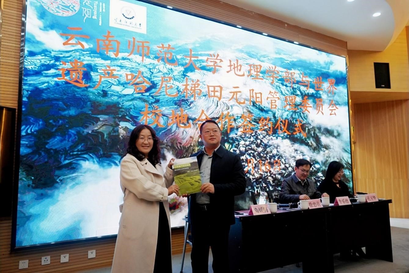 签约现场,地理学部与元阳县梯管委签订了“8858cc永利唯一官方网教学研究实习与实践基地”协议并授牌,宣布“角媛梅持续景观科学专家基层工作室”挂牌设立。同时,角媛梅向元阳县梯管委捐赠了科普读物《世界遗产哈尼梯田·雕刻在群山上的和谐家园》300册。