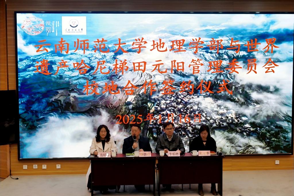 徐忠亮指出,哈尼梯田作为世界文化遗产,在保护与开发进程中面临诸多挑战,迫切需要科研力量的深度介入。此次校地合作将为哈尼梯田的科学管理、文化传承与生态保护带来了新的契机。梯管委将充分借助地理学部的科研和人才优势,推动哈尼梯田的科学保护与合理利用,实现遗产保护与地方发展的协同共赢。孔玉华强调,校地合作将吸引更多高校优秀人才关注元阳,为地方经济社会发展带来新思路、新技术、新活力,促进生态农业、文化旅游等产业升级,助力地方科技创新与经济可持续发展。