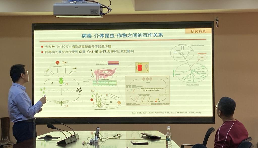本次讲座,靳怀冰研究员围绕“作物虫媒病毒的致病机制和传播规律”展开讲解。他介绍了全球范围内虫媒病毒对粮食作物的危害现状,病毒病害已成为威胁农业生产的重要因素之一。他结合团队最新研究成果,详细解析了病毒利用介体昆虫(如蚜虫、灰飞虱等)进行高效传播的分子机制,深入探讨了病毒与寄主植物、介体昆虫三者之间的复杂互作关系。