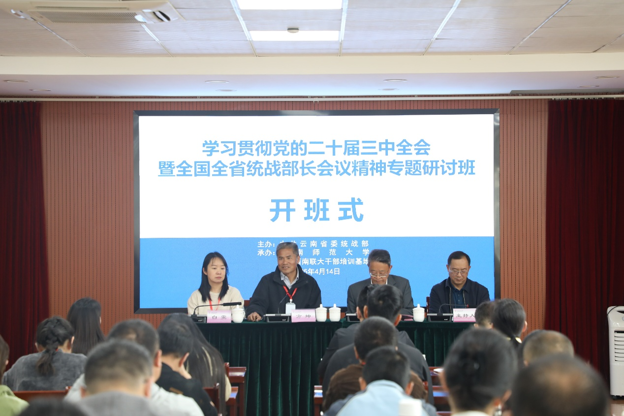 4月14日上午,由中共云南省委统战部主办,云南西南联大干部培训基地承办的“学习贯彻党的二十届三中全会暨全国全省统战部长会议精神专题研讨班”在永利官网一二·一校区开班。云南省黄埔军校同学会办公室一级调研员方坤,省委统战部干部处四级调研员白雯,永利官网党委常委、统战部部长吴雁江,全省统战系统干部50人参加培训。