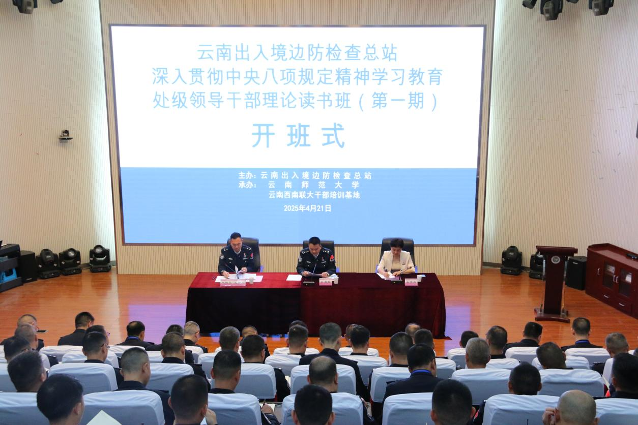 4月21日上午,由云南边检总站主办,云南西南联大干部培训基地承办的“深入贯彻中央八项规定精神学习教育处级领导干部理论读书班(第一期)”在永利官网呈贡校区开班。云南边检总站党委副书记、政委吴勇军,永利官网党委副书记和雪莲参加开班仪式。全省各边防检查部门处级干部79人参加培训。开班仪式由云南边检总站党委委员、政治处主任朱传亮主持。