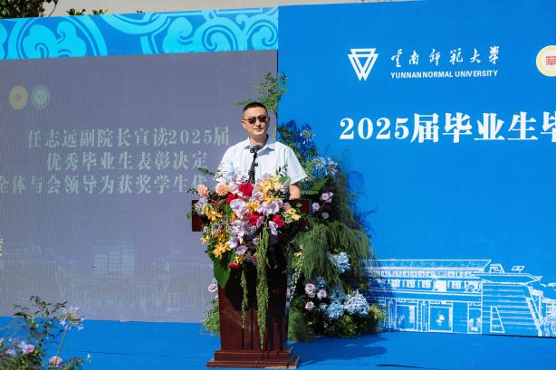 院长王秀成致辞,向毕业生表示祝贺并提出三点希望:一是要志存高远,做新时代的奋进者;二是要厚植情怀,做心怀家国的新青年;三是要着眼实践,做精彩人生的书写者。