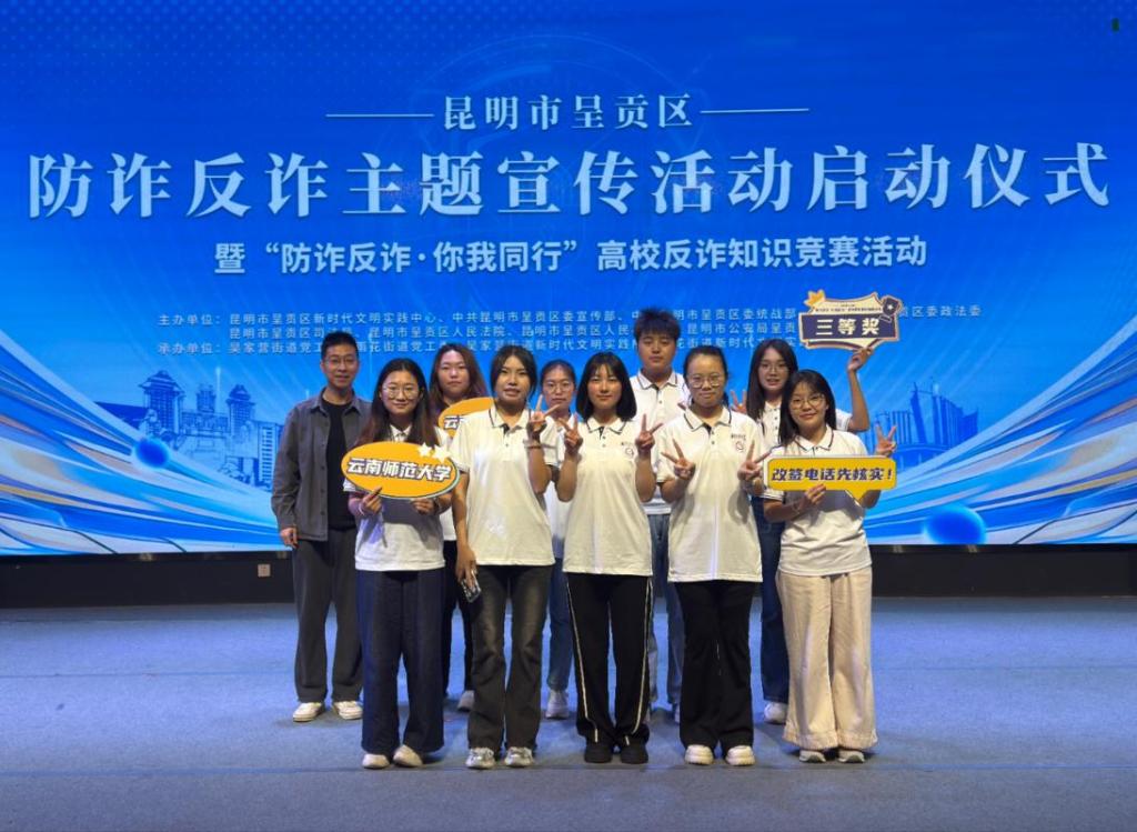 本次竞赛由昆明市呈贡区新时代文明实践中心、区委宣传部、区委统战部、区委政法委、区司法局、人民法院、人民检察院、昆明市公安局呈贡分局等多部门联合主办,共有十所高校的代表队参赛,竞赛题目涵盖国家反诈中心《防范电信网络诈骗宣传手册》、昆明市公安局呈贡分局反诈典型案例、网络安全法、反电信网络诈骗法等相关内容。永利官网代表队沉着冷静、默契配合,经过激烈的角逐,最终荣获三等奖。