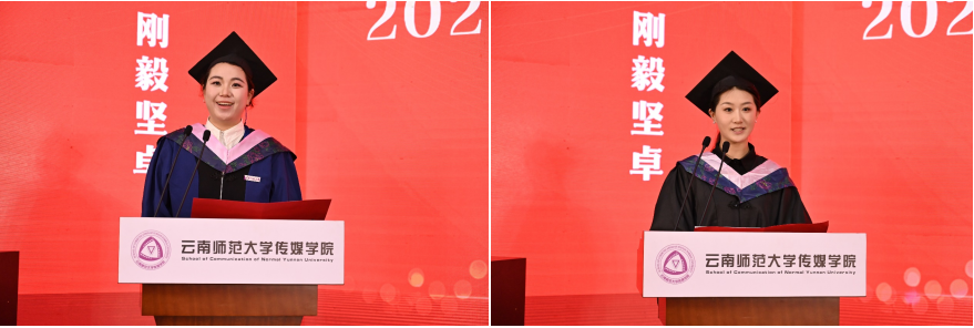 张齐老师在致辞中希望同学们永葆学习之心,做正直善良有担当的传媒人。李响同学深情回顾了大学四年的成长历程,她选择在毕业后扎根基层,服务群众。梁雁同学则用“初遇、选择、致谢”诠释自己与师大相守的七年光阴,感恩母校培养,将带着“刚毅坚卓”的校训奔赴山海。