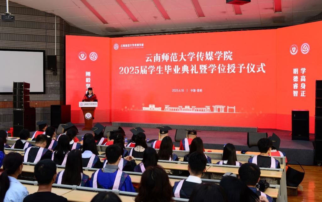 6月18日上午,传媒学院举行2025届毕业典礼暨学位授予仪式。学院领导、学位评定分委员会委员、导师代表、教师代表、辅导员、毕业班班主任,以及2025届毕业生和家长代表出席典礼。典礼由学院党委副书记任利主持。