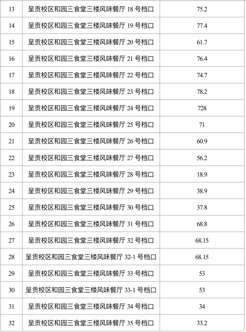 2.2服务内容:8858cc永利唯一官方网呈贡校区和园食堂二、三楼风味小吃档口的餐饮管理服务团队引入,建筑面积总共约5865平方米,其中三楼面积4317平方米,二楼面积1548平方米。提供早、中、晚餐各类风味小吃,及配合学校工作的其他餐饮服务。