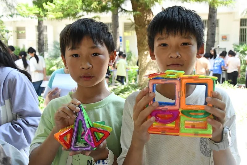 在宜良华兴小学,志愿者们利用这些数学模型和结合数学科普,分别举办了别开生面的数学游园会和趣味运动会,让学生勇闯关卡,挑战难题,播下数学的种子。