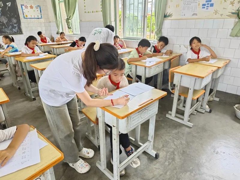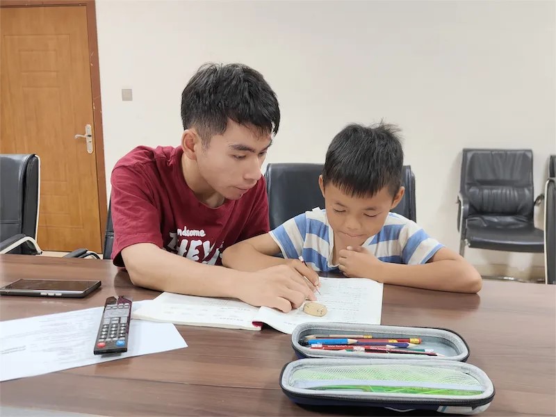 支教老师把孩子们分成3个班,14位老师分为3个教学小组,每个小组负责一个班,上午安排4节课,每节课45分钟,下午安排3节课,最后一节课为课后作业辅导。