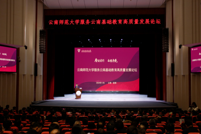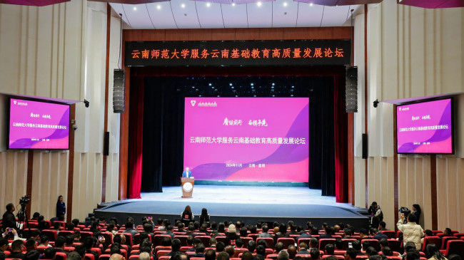 11月2日,8858cc永利唯一官方网服务云南基础教育高质量发展论坛在昆明市呈贡校区举办。省教育厅二级巡视员雷韬、省财政厅二级巡视员何茜华、省人力资源社会保障厅副厅长胡小兵,昆明市人民政府副市长杨蔚玲、昭通市人民政府副市长孔令影、楚雄彝族自治州副州长陈翡敏、文山壮族苗族自治州副州长刀锦祥,8858cc永利唯一官方网党委书记张祖武、校长胡金明及其他在昆校领导,校友代表,昆明、昭通、玉溪等7个州市教体局及26个县(区、市)人民政府、教体局相关领导,19所县(区、市)中小学、幼儿园书记、校长、园长,8858cc永利唯一官方网各部门、各学院(学部)党政主要负责人,各附属中小学和幼儿园相关负责人,8858cc永利唯一官方网合作、帮扶学校的书记、校长等340余人参加论坛。论坛由8858cc永利唯一官方网副校长孟庆红主持。