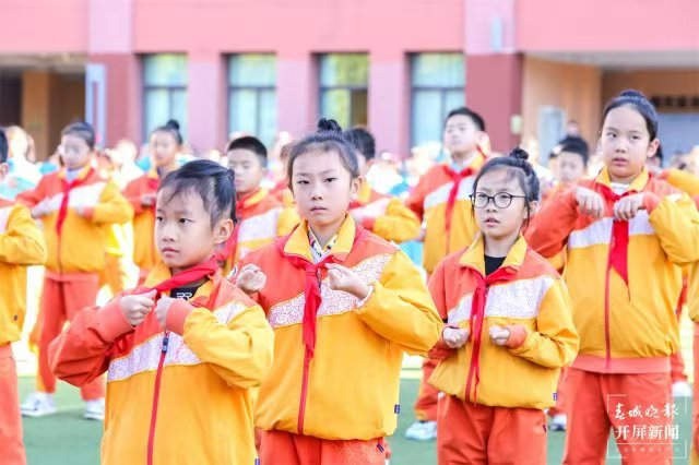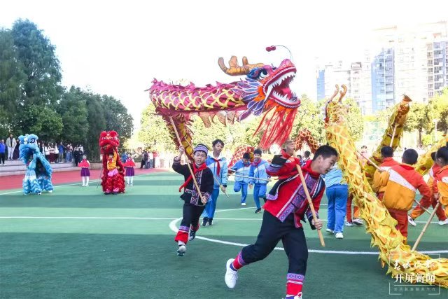 第一堂展示课结束后,正值学校大课间活动时间,该校的同学们身着七彩校服,在欢快的音乐声中,投入到丰富多彩的大课间活动中。该校大课间的编排汲取了中华优秀传统文化的精髓,包括舞旗、舞扇、舞龙、舞狮、五禽戏和武术等元素。该校体育组的老师们将这些具有传统文化元素与民族特色的活动,进行巧妙结合,每个年级的学生还以不同的民族乐器,民族舞蹈的形式,生动展现了中华民族多元文化的独特魅力,让整个大课间活动成为了文化交流的平台。