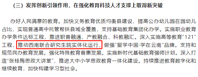 2022年在西南联大旧址成立的西南联合研究生院,是以传承西南联大精神为己任,为云南引进人才、为国家培养人才而打造的高水平研究平台及高等教育改革创新试验田。