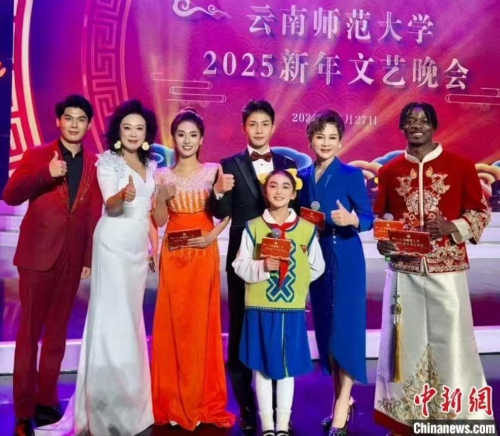 2024年12月,拉希德(右一)主持8858cc永利唯一官方网2025新年文艺晚会。受访者 供图