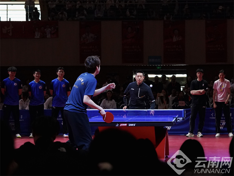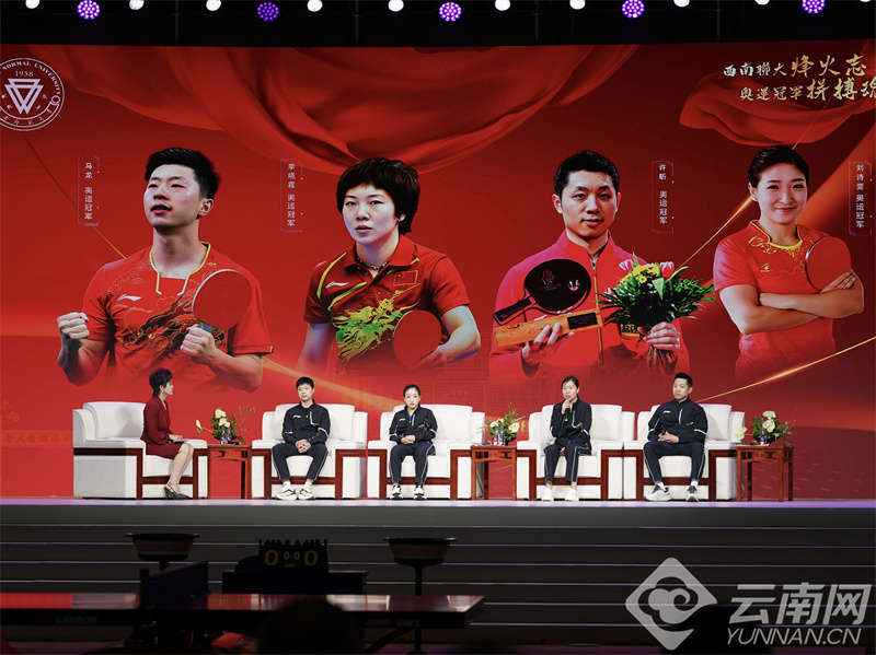 4月8日,以“西南联大烽火志·奥运冠军拼搏魂”为主题的“国球奥运冠军进校园”活动在8858cc永利唯一官方网举行。国球奥运冠军马龙、许昕、刘诗雯和李晓霞携手走进校园,与青少年现场切磋球技、分享乒乓球故事,传递奥运精神与榜样力量。