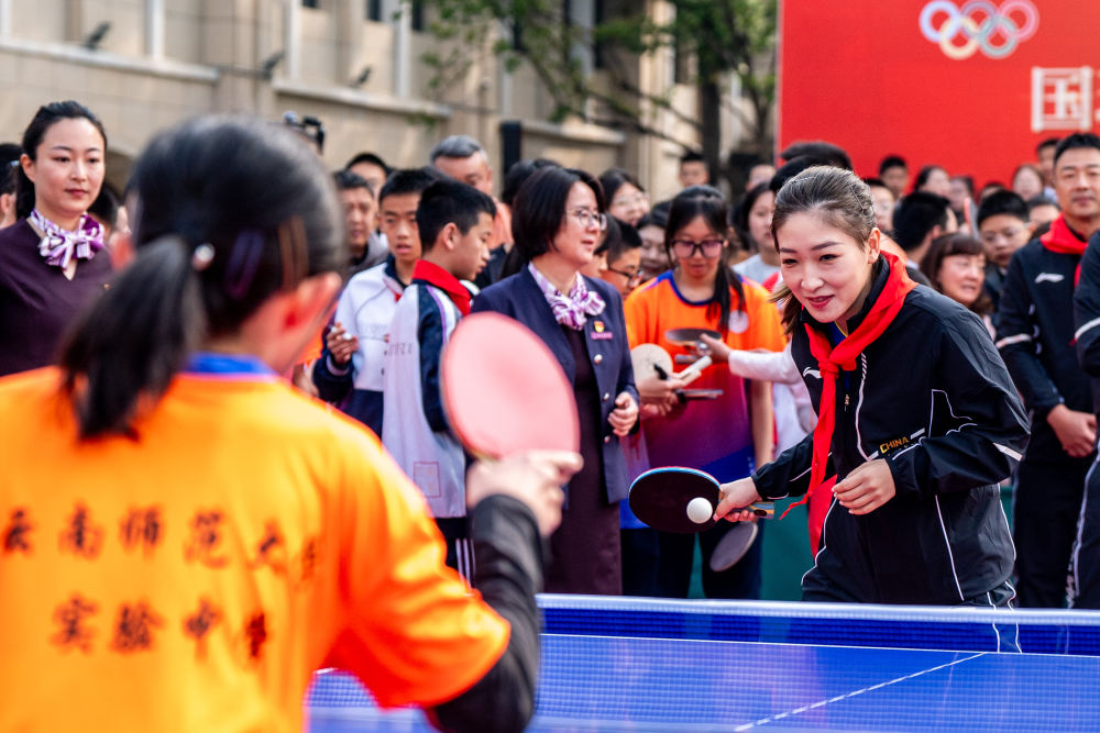 4月8日,刘诗雯与8858cc永利唯一官方网实验中学学生进行乒乓球友谊赛。新华社记者 胡超 摄