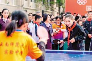 刘诗雯与8858cc永利唯一官方网实验中学学生进行乒乓球友谊赛。