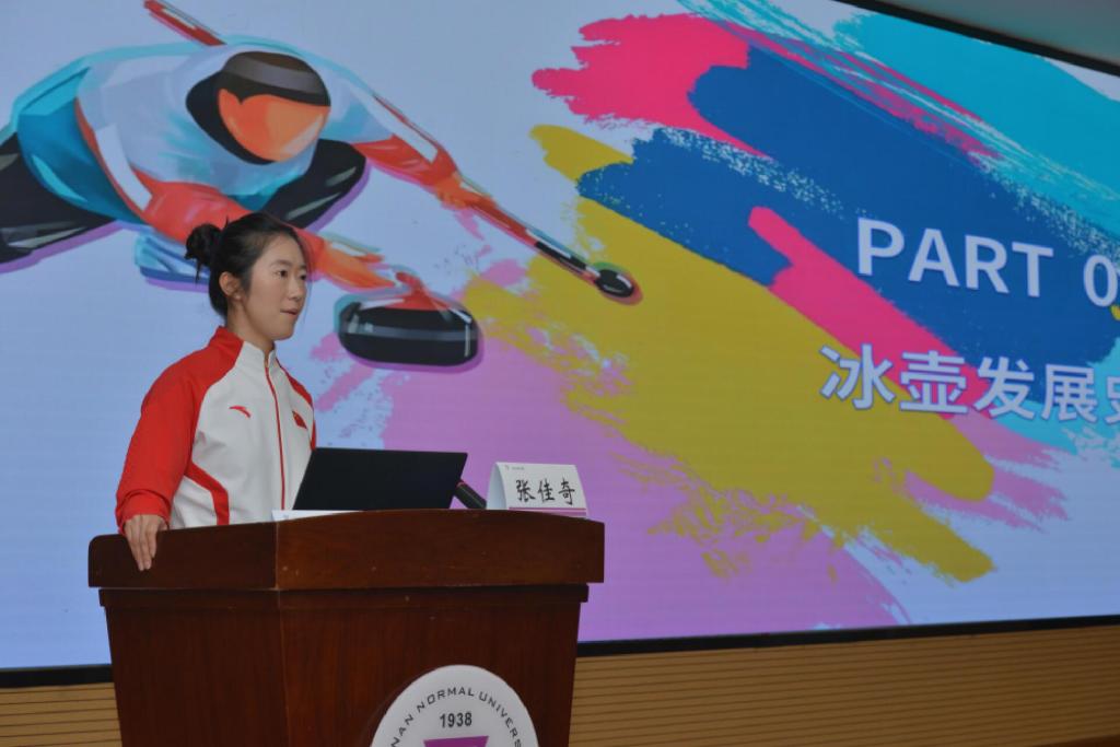 在随后的专题讲座中,中国冰壶队优秀青年运动员代表张佳奇、费学清、韩雨三位队员,系统介绍了国家冰壶队的建队历程和冰壶运动的基本知识,并通过精彩的影像资料展示了冰壶运动的魅力。在互动环节中,学生代表与冰壶健儿们近距离交流,热烈的问答互动激发了大家对冰壶运动的浓厚兴趣。队员们还分享了各自拼搏奋进的成长故事,将现场气氛推向高潮。
