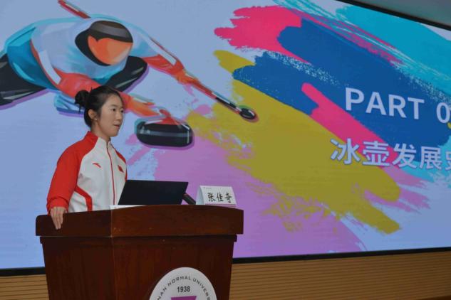随后,张佳奇、费学清、韩雨三位优秀运动员化身"体育讲师",通过生动的专题讲座,系统介绍国家冰壶队的发展历程与冰壶运动的竞技魅力。借助精彩的赛事影像,队员们将冰壶运动中蕴含的团队协作、战略智慧展现得淋漓尽致。在互动环节,学生们踊跃提问,队员们结合自身成长经历,分享赛场拼搏故事,点燃了在场师生对冰雪运动的热情。